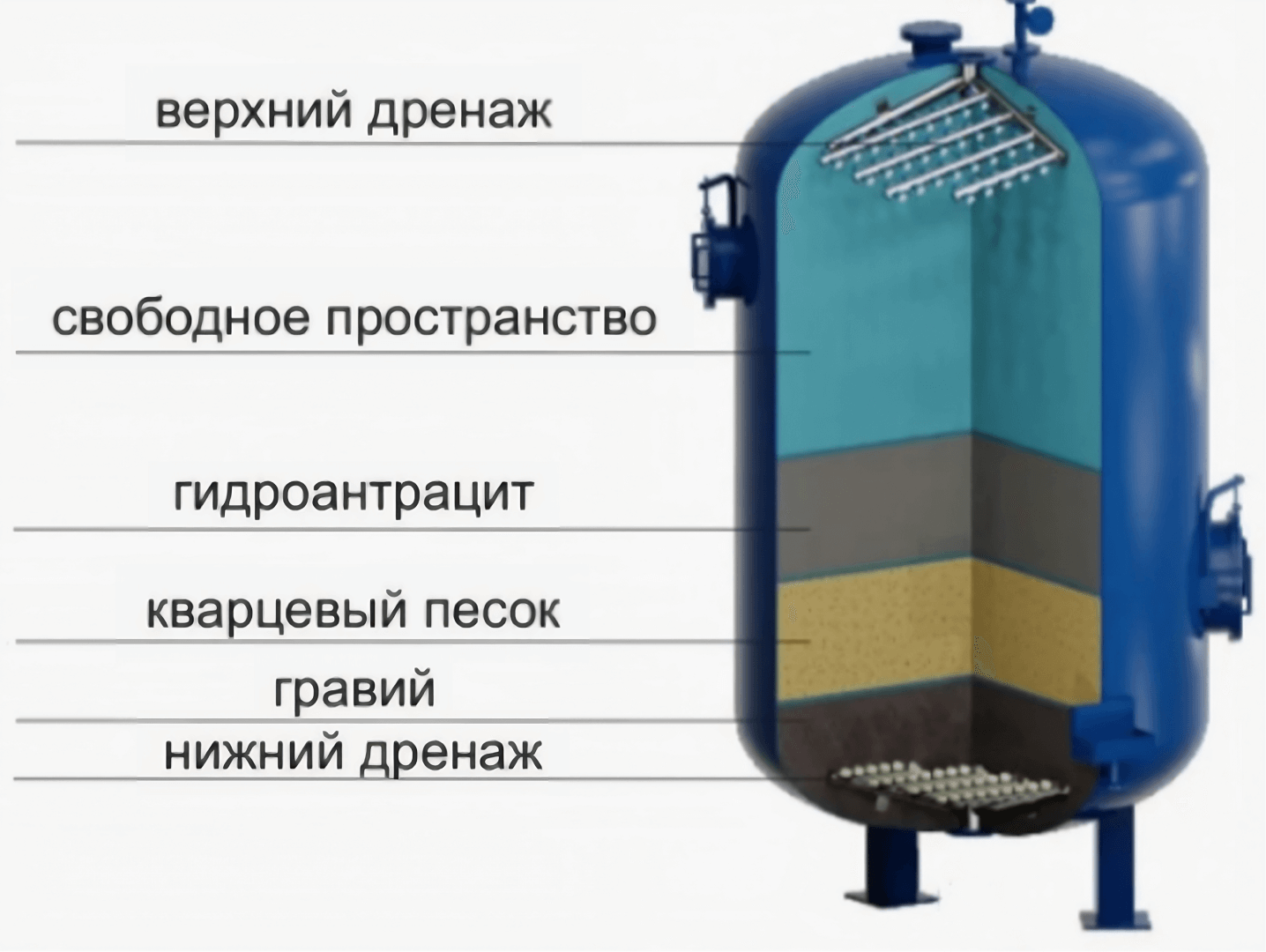 Каждый фильтр загружается щебнем (нижний слой), который является поддерживающим слоем для основной загрузки, антрацит (верхний слой) и кварцевый песок (средний слой).