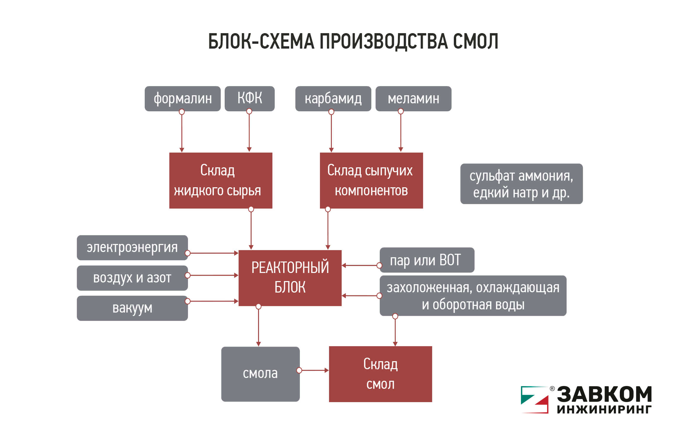 Подаётся сырьё со складов, а также электроэнергия, воздух и азот, вакуум, пар и ВОТ, захоложенная, охлаждающая или оборотная вода.