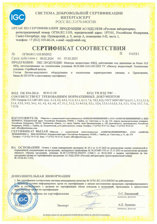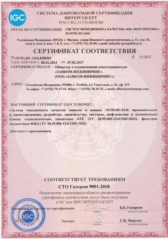 В этом году ООО «ЗАВКОМ-ИНЖИНИРИНГ» принимает участие в системе добровольной сертификации ИНТЕРГАЗСЕРТ. Система создана ПАО «Газпром» в 2016 году с целью подтверждения функциональных показателей и показателей качества продукции, поставляемой российскими компаниями.