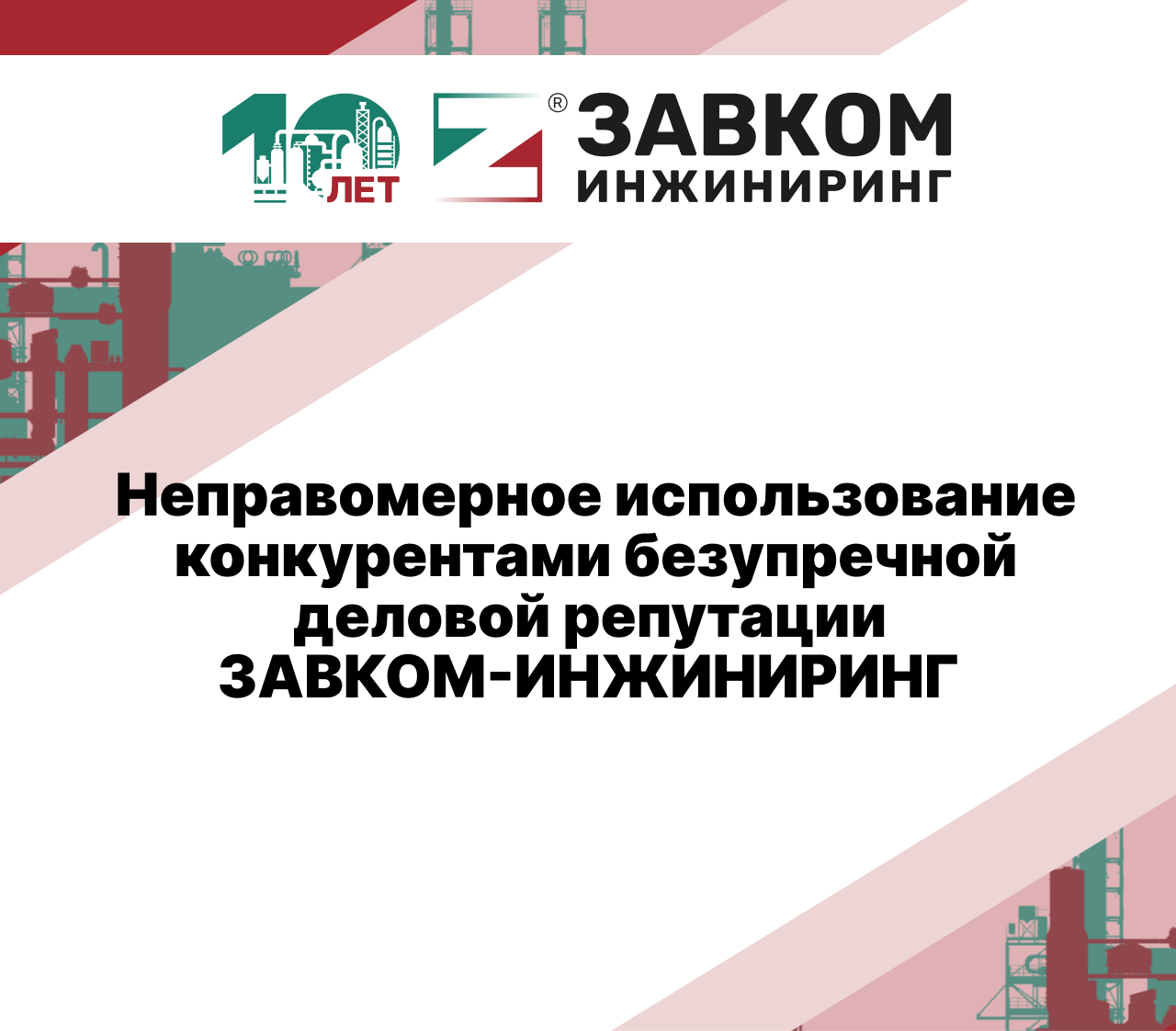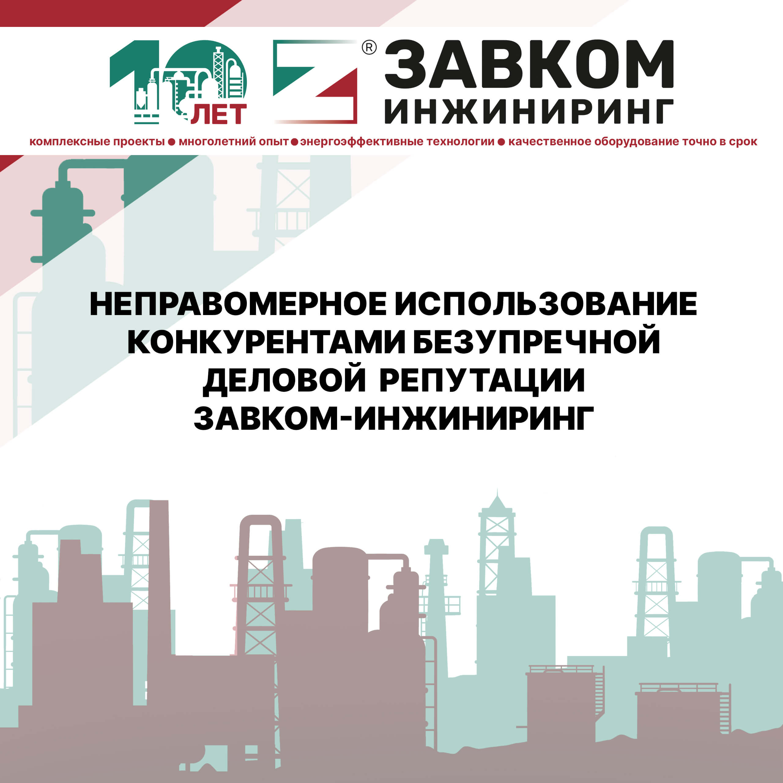 Попытки конкурентов каким-либо образом связать свою деятельность с ООО «ЗАВКОМ-ИНЖИНИРИНГ», использовать референс-лист без соответствующего разрешения, некорректно ассоциировать себя с нами — это способы недобросовестной конкуренции, направленные исключительно на нанесение ущерба деловой репутации ООО «ЗАВКОМ-ИНЖИНИРИНГ» и снижение уровня доверия к нам, что является незаконным.