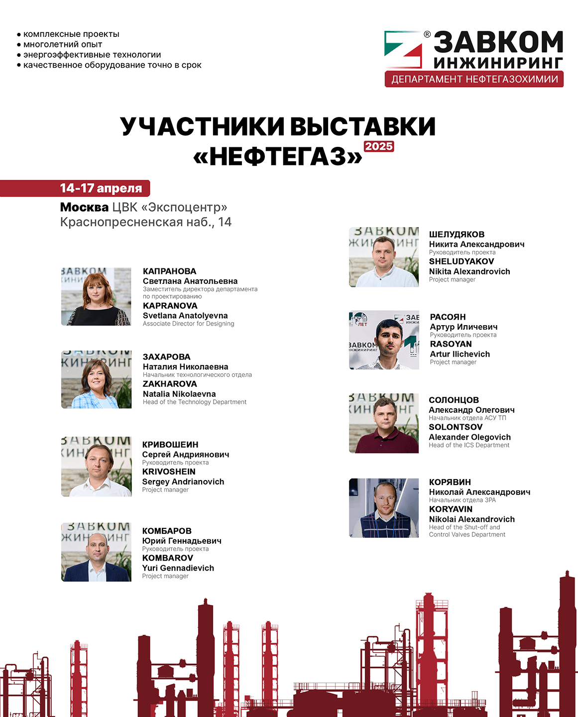 ООО «ЗАВКОМ-ИНЖИНИРИНГ» является постоянным экспонентом крупнейшего отраслевого мероприятия и ежегодно представляет гостям своего стенда уникальные возможности и комплексные решения компании по реализации объектов нефтегазохимической отрасли.