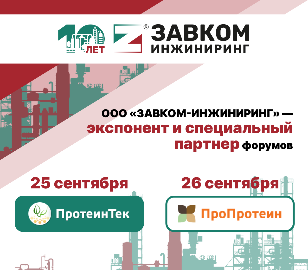 Наша компания принимает участие в Форумах и выставках «ПротеинТек» и «ПроПротеин» в качестве экспонента и специального партнёра проектов. Ежегодно ООО «ЗАВКОМ-ИНЖИНИРИНГ» представляет уникальные возможности и услуги по поставке заводов переработки гороха, производства кормового белка, микробного белка, полученного из природного газа.